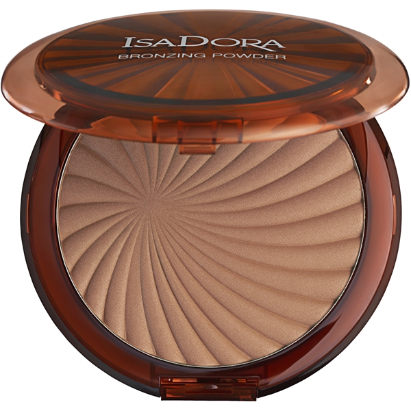 IsaDora Bronzing Powder is a highly pigmented large bronzing powder for a fresh, sun-kissed look with a semi-transparent effect. It can be applied on the face, shoulders, and décolletage. Suitable for all skin types. Unscented. Clinically tested.