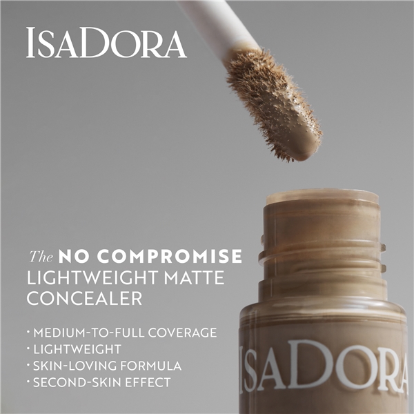 IsaDora No Compromise Lightweight Concealer is a feather-light concealer with full coverage and skincare properties that provides a matte natural finish.