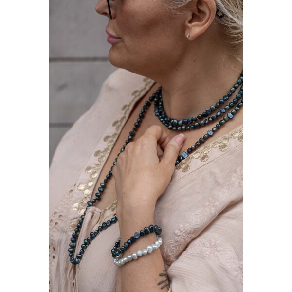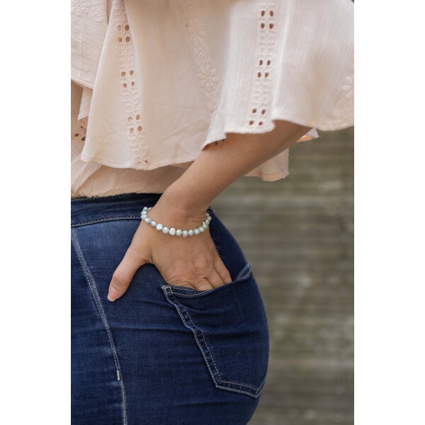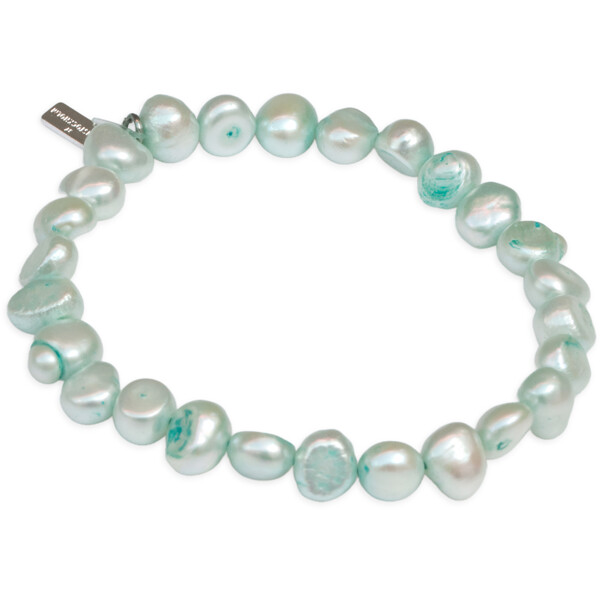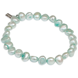 A light turquoise elastic pearl bracelet with genuine freshwater pearls. Since the pearls are dyed in turquoise, there are some spots on the pearls with extra turquoise where the pearls have an uneven surface.