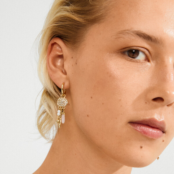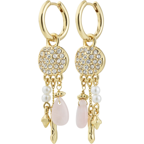 The gold-plated SHIFT hoops from Pilgrim's Moments of Change collection are the ultimate combination of boho chic and playful elegance. Small coin pendants, adorned with sparkling Preciosa crystals, reflect the light in a magical way while pearlescent glass beads and the love stone rose quartz provide a light and free feeling. A playful combination of details that gives your look a dreamy and unique energy.