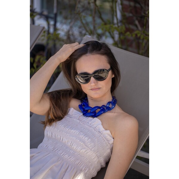 A blue resin necklace featuring 3 large dark blue links in the centre, with transparent blue links on the sides.