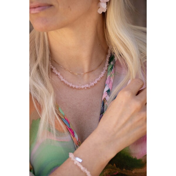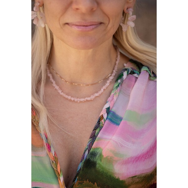 A cool necklace with small pink rose quartz stones.