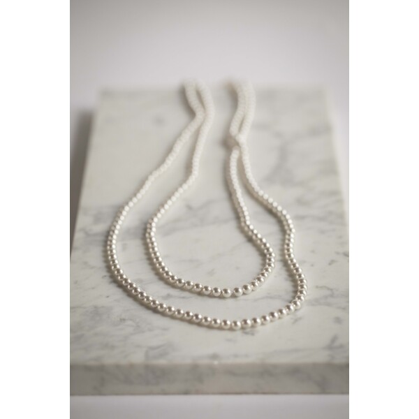 A stylish, trendy, and beautiful necklace with small white shell pearls/Mother of Pearls. The necklace is long – 110 cm, and you can wear it double around your neck if you don't want to wear it as it is. The necklace has no clasp/opening.